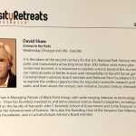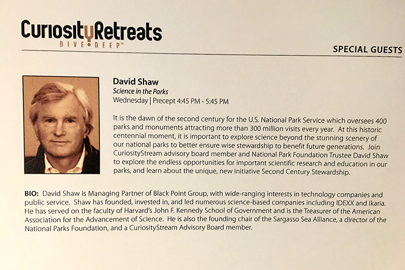 I discussed the US national park centennial and our recently launched Second Century collaboration to expand science IN and FOR national parks. Our film launching Second Century is available on our streaming video on demand service, Curiosity Stream. I showed excerpts from the film at the retreat .